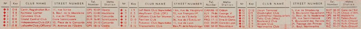 It is simple enough to read down the Club list chronologically from No. 0 ("Centr. Registration Bur.") to No.18 ("Montmartre Club") and across each column to learn the club address, telephone number and Paris metro station. Some club names are literal and denote military rank required to enter, others former hotel names, local historic events or individuals. Some club names require additional cues. For example, no.4, the "Independence Club (Of.)" and No. 5 "Lafayette Club (Officers)" are two of three clubs reserved for officers. The terms in parenthesis are an unambiguous cue. No. 15 is "Patio Club (Wac)" the cue in parenthesis addressed to Women's Army Corp personnel. No. 8 "Officers Club for Women"is a self explanatory, literal club name.
