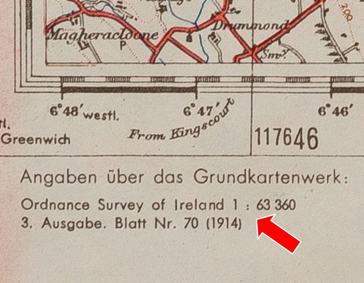 There is a final non-Red Cross element that distinguishes our map and offers insights about conditions in Paris after August 25, 1944. The format of our map is designed as a single sided map. Our map was printed in Paris immediately following Paris' liberation and should be understood in the context of 1944 shortages in the French civilian population of food, fuel and medicine. Our example of the Red Cross Map is printed on paper Blondel La Rougery repurposed from its old map print runs and thus illustrates a paper shortage even for a client paying for thousands of maps. Our map is printed on the blank verso of a panel of a German language topographic map (Fig. 2, page 16) section titled "Dundalk" in the top margin, the lower left corner reading "Ordnance Survey of Ireland...Blatt Nr. 70 (1914)." Dundalk, County Louth is on the north east coast of Ireland, just below Northern Ireland. (Fig. 6) I am aware of no connection between 1944 Paris and 1914 Dundalk.